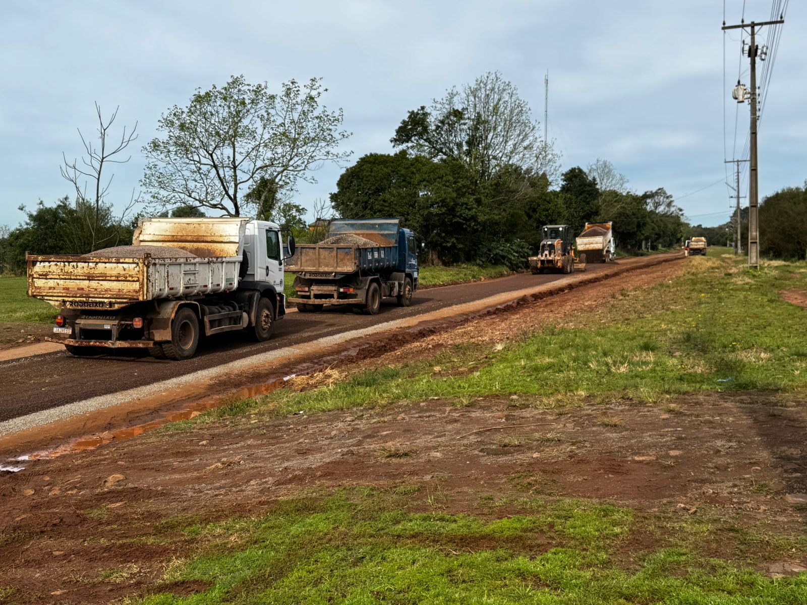 A localidade de Rincão do Sobrado recebeu patrolamento e manutenção nas vias. Já em parte de Passo da Mangueira foi realizada a colocação de brita, garantindo melhores condições para os moradores e produtores rurais.