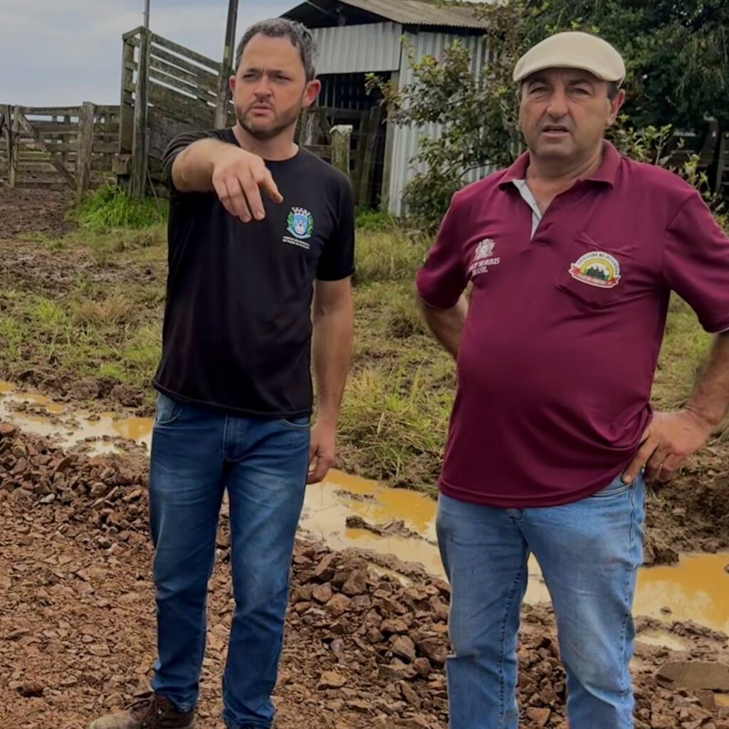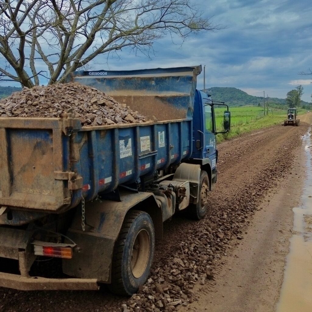 O secretário interino de Obras e Trânsito, Selmo Loco, e o secretário de Agricultura e Meio Ambiente, André Luiz Muller, acompanham os trabalhos realizados pelas equipes que estão atuando na manutenção da estrada geral de Porteiro Grande e Max Brum, além de seguir com atendimentos aos produtores rurais e ações voltadas ao fortalecimento da agricultura.