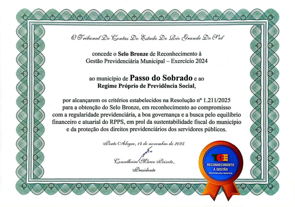 O Tribunal de Contas do Estado (TCE) do Rio Grande do Sul concedeu ao município de Passo do Sobrado o Selo Bronze de Reconhecimento à Gestão Previdenciária Municipal / Exercício 2024. Este importante reconhecimento destaca a excelência da administração local.