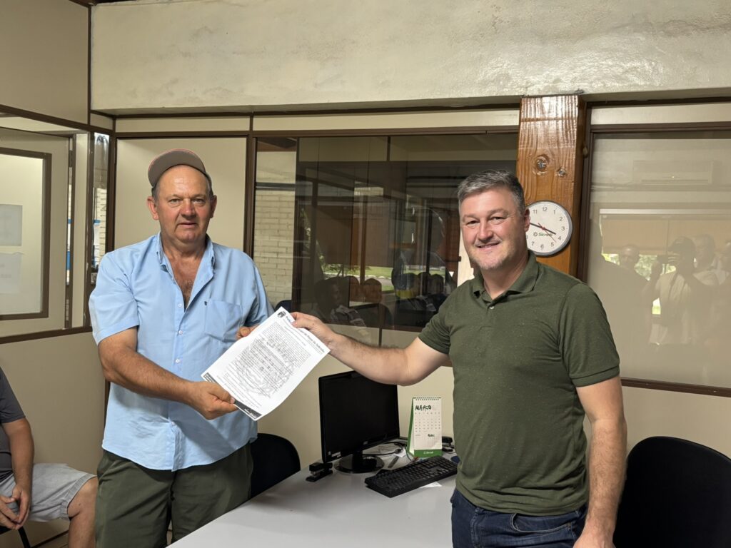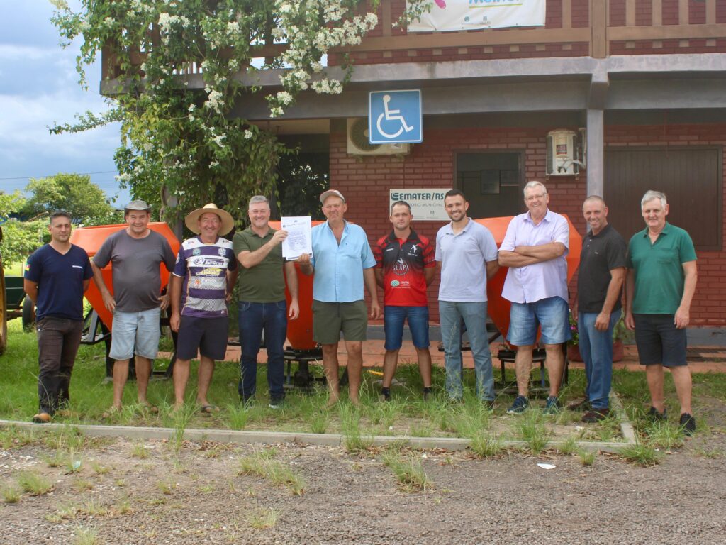Na tarde de hoje, 26 de fevereiro, Prefeito Edgar Thiesen acompanhado do Vice-Prefeito Jander de Carvalho Thisen, representante da Emater Maikel, funcionários públicos e membros da Associação Bacia Leiteira de Passo do Sobrado, estiveram juntamente na Secretaria Municipal de Agricultura para a realizar a assinatura de cedência e entrega de três semeadeiras hidráulicas com capacidade mínima de 600 litros e uma plantadeira hidráulica de três linhas, com o objetivo de fortalecer a produção, a industrialização e a comercialização dos produtos derivados da Bacia Leiteira do nosso município.