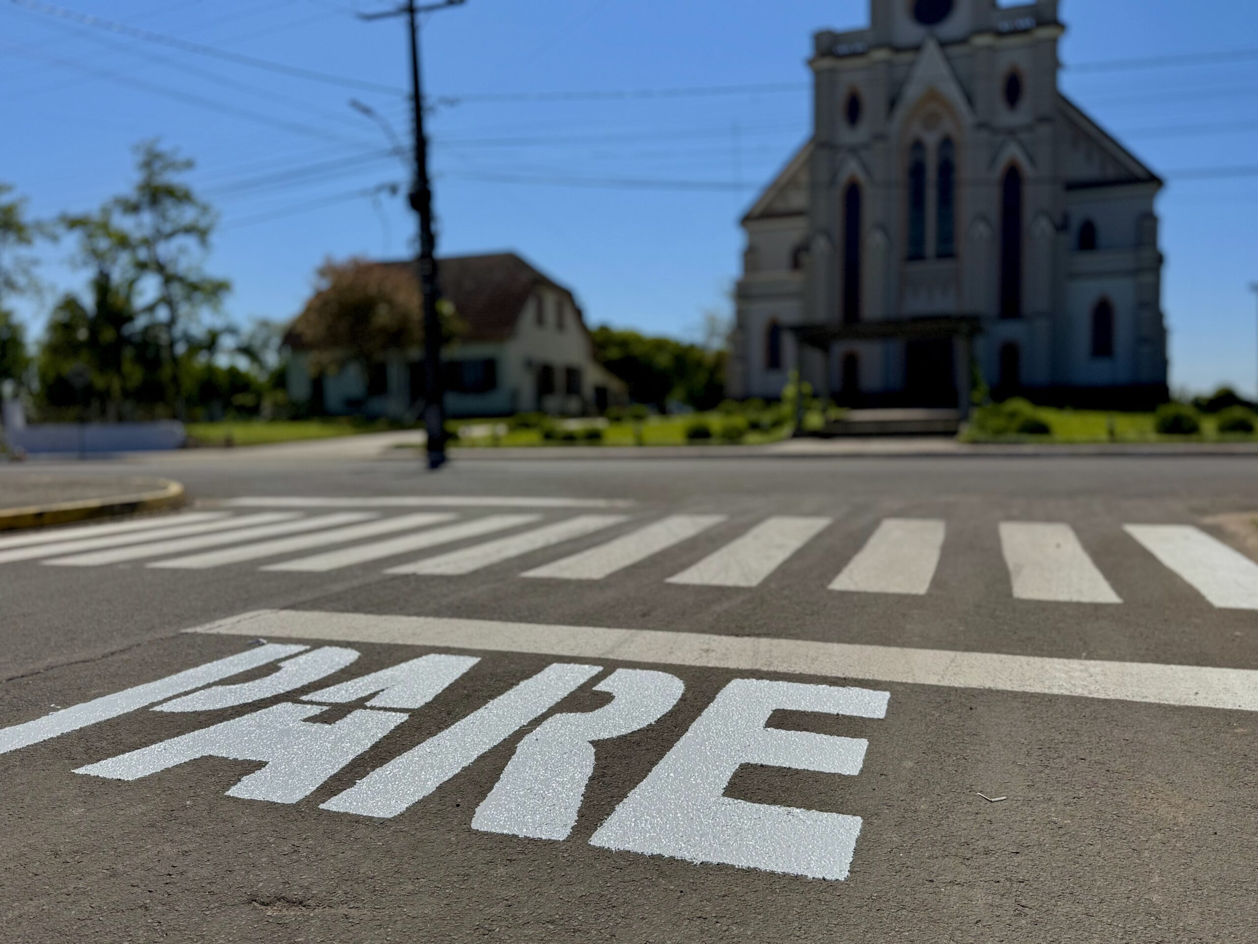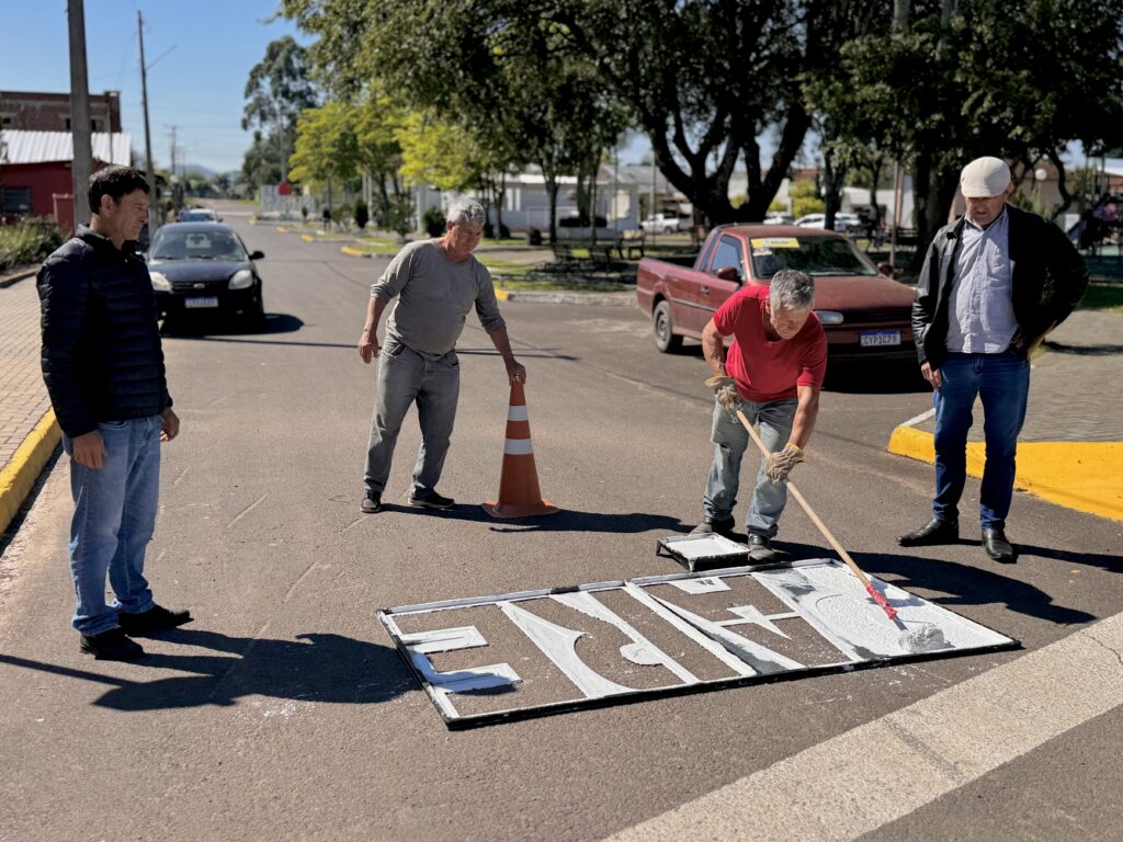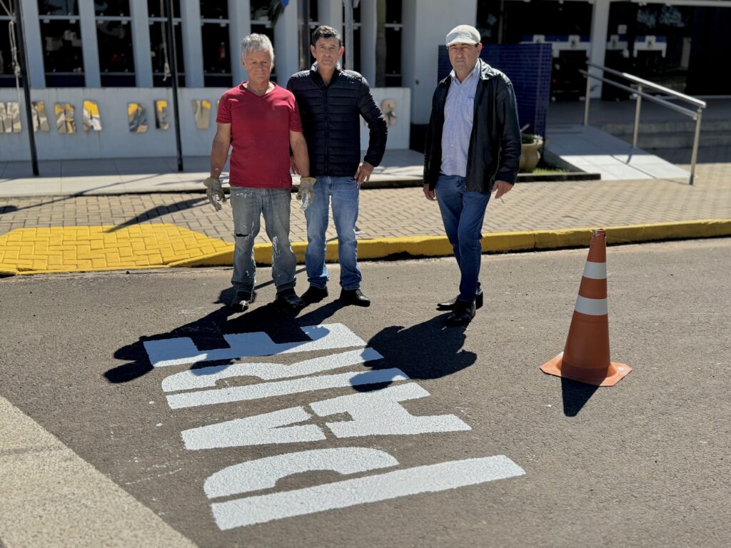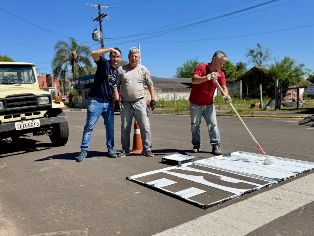 A Secretaria de Obras e Trânsito, está realizando a pintura da palavra “PARE” em diversos pontos das ruas do município.