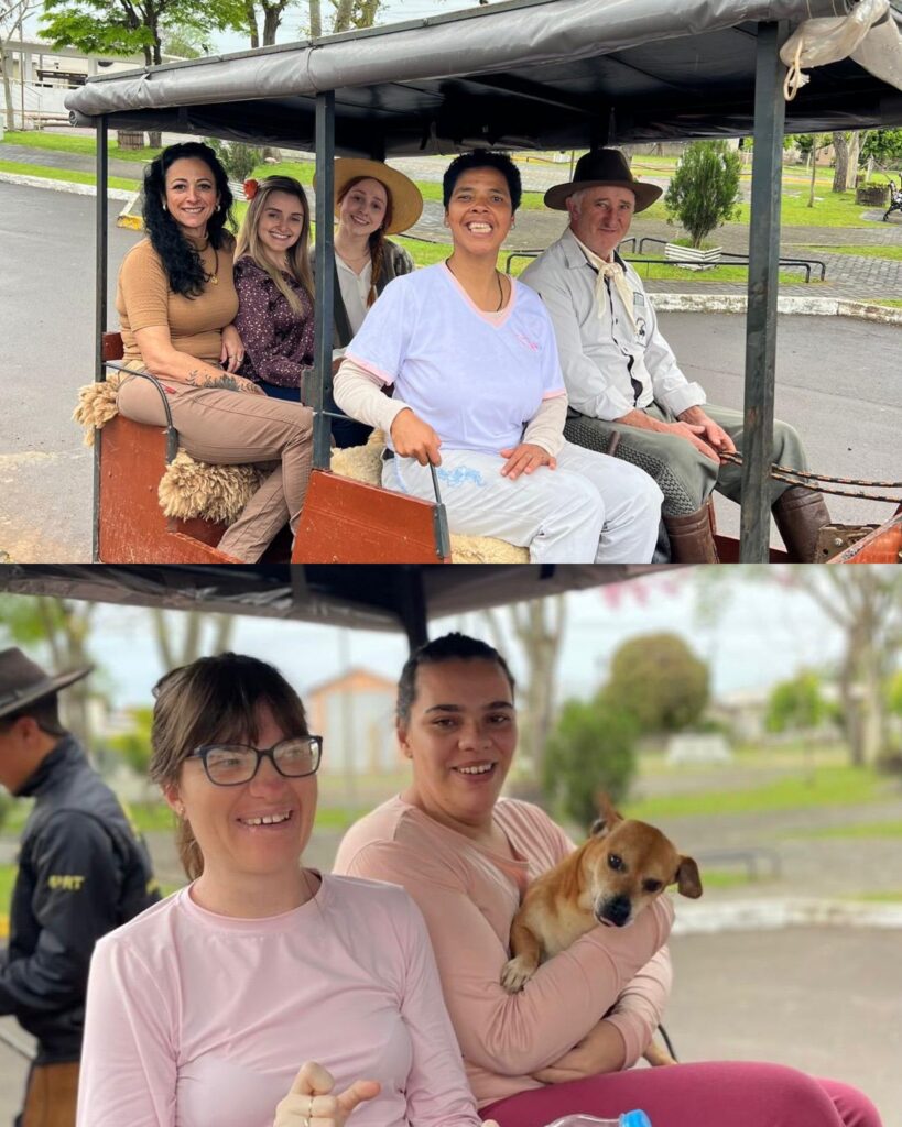 Através da parceria com a Secretaria Municipal de Educação e Cultura, na sexta-feira, dia 19 no Acampamento, o grupo de PcDs participou de atividades integradas ao “Projeto Giovane Menezes” com o CTG Gaudérios da Querência, como um passeio pelo centro da cidade de “chez” e a cavalo.